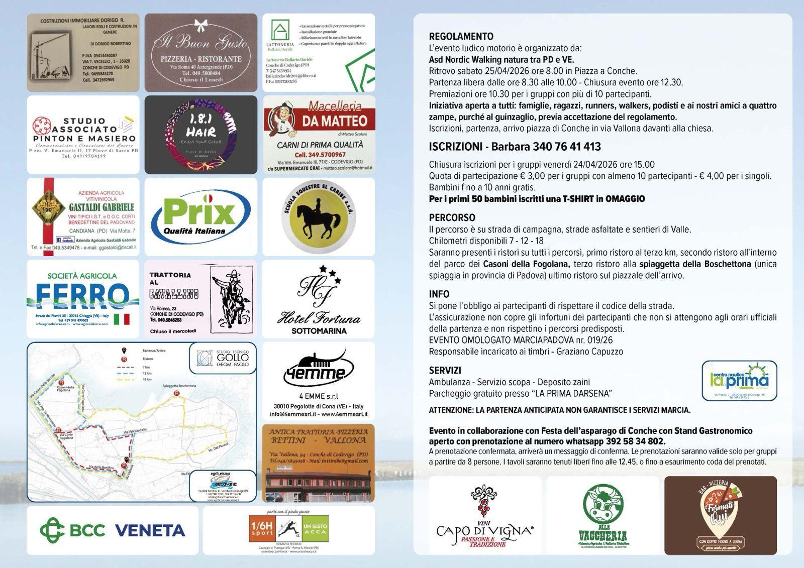 L’evento è organizzato da Asd Nordic Walking Natura tra Padova e Venezia in collaborazione con la Festa dell’asparago di Conche, ed è patrocinato da Regione Veneto, da Provincia di Padova, dal Comune di Codevigo e Città di Chioggia.