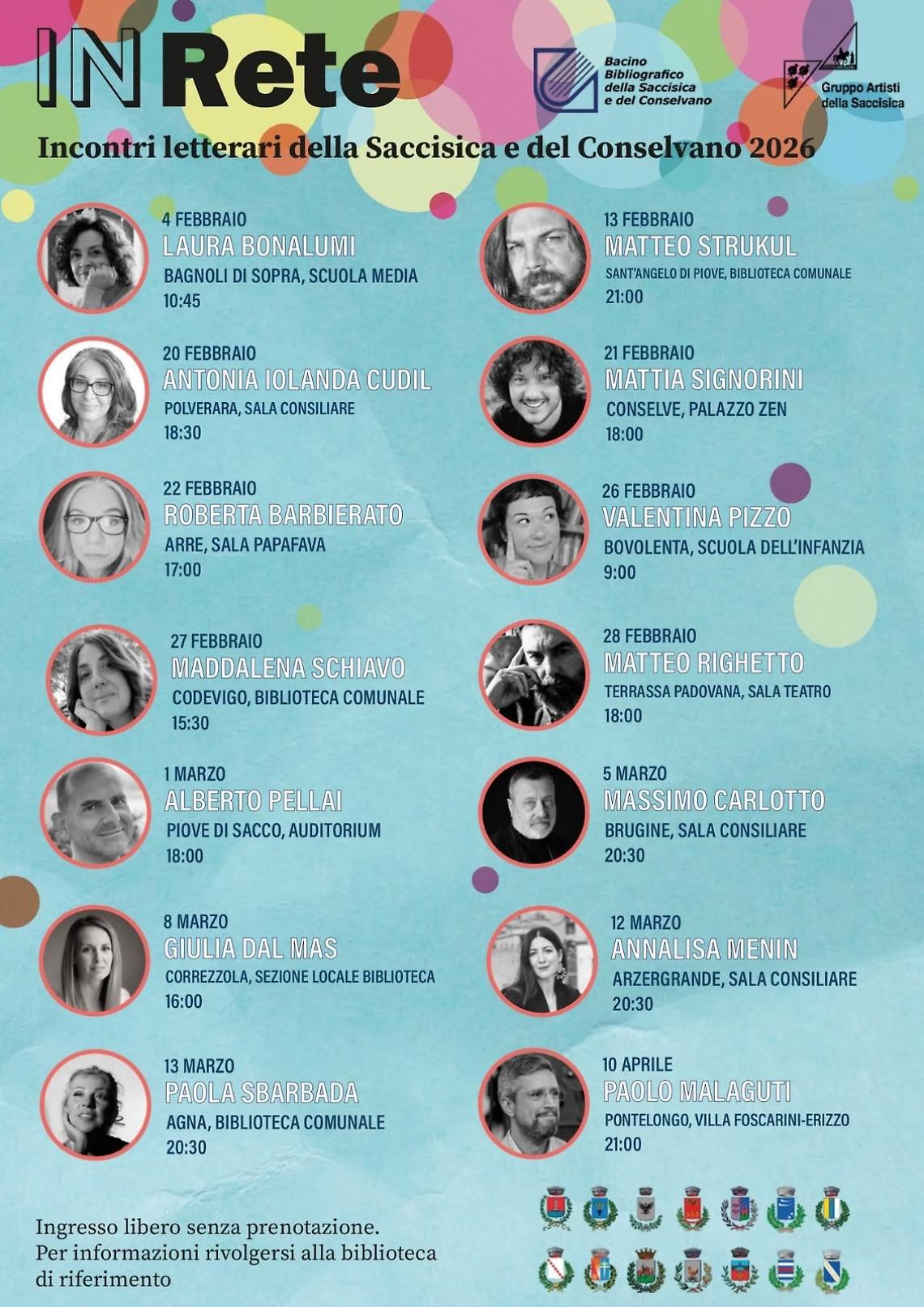 Con “In Rete” la letteratura fa comunità. Torna “In Rete – Incontri letterari della Saccisica e del Conselvano”, la rassegna che per oltre due mesi porterà scrittrici e scrittori in biblioteche, scuole, auditorium e sale civiche di numerosi Comuni dell’area, creando un vero e proprio circuito culturale. Un calendario fitto, diffuso e condiviso che mette al centro la letteratura e il territorio. L’iniziativa è promossa dal Bacino bibliografico della Saccisica e del Conselvano insieme al Gruppo Artisti della Saccisica, con il coinvolgimento delle amministrazioni locali e delle biblioteche aderenti. Il calendario di febbraio propone poi Antonia Iolanda Cudil in sala consiliare a Polverara (venerdì 20 alle 18.30), Mattia Signorini al Palazzo Zene di Conselve (sabato 21 alle 18), Roberta Barbierato in sala Papafava ad Arre (domenica 22 alle 17), Valentina Pizzo alla scuola dell’infanzia di Bovolenta (giovedì 26 alle 9), Maddalena Schiavo in biblioteca a Codevigo (venerdì 27 alle 15.30) e Matteo Righetto a Terrassa Padovana (sabato 28 alle 18).