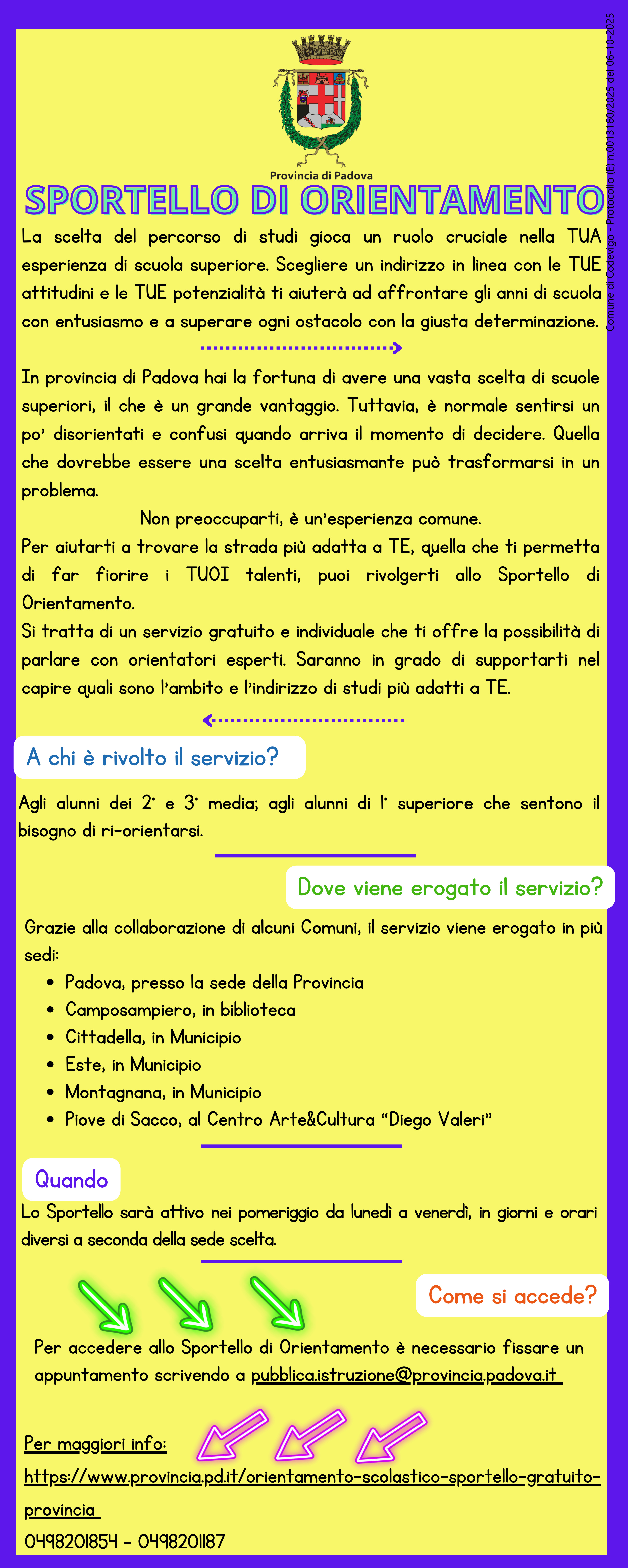 Supportato dal grande apprezzamento da parte delle famiglie, degli stessi alunni e del personale scolastico, il servizio Pubblica Istruzione della Provincia di Padova ripropone lo sportello Orientamento per le studentesse e gli studenti che frequentano quest'anno la classe 2^ e 3^ della scuola secondaria di primo grado e della classe 1^ delle scuole superiori che sentono il bisogno di ri-orientarsi.